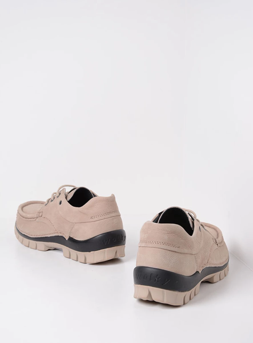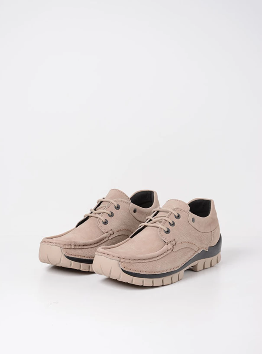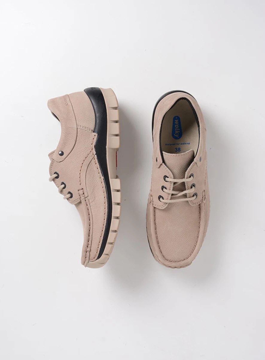 Verlassen Sie Ihr Haus mit Wolkys Fly mit Stil! Dieser lässige Schnürhalbschuh hat eine tolle Farbkombination mit einem extra verspielten Effekt, der es so aussehen lässt, als wäre das Leder am Knöchel umgeschlagen. Der Fly ist durch die Zweikomponentensohle besonders bequem. Die Zwischensohle ist aus PU, was den Schuh leicht macht, und der untere Teil der Sohle ist aus TR. Dies sorgt für die Dämpfung und die Biegsamkeit. Außerdem hat Wolkys Fly eine Mokassin-Naht, die für zusätzliche Flexibilität sorgt.