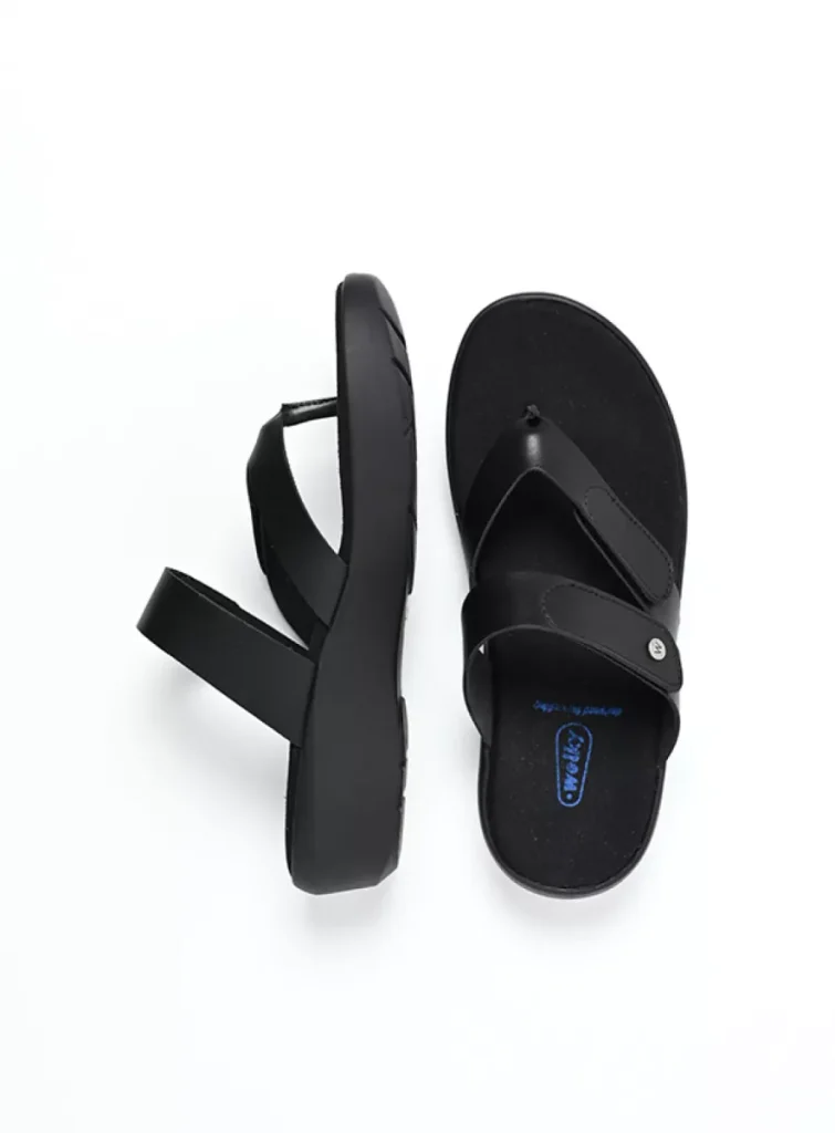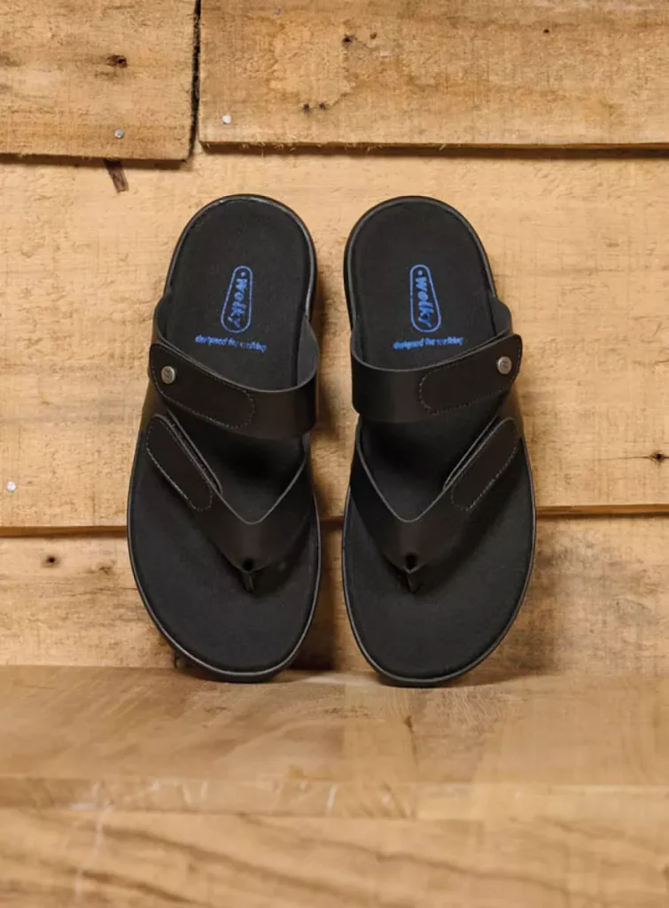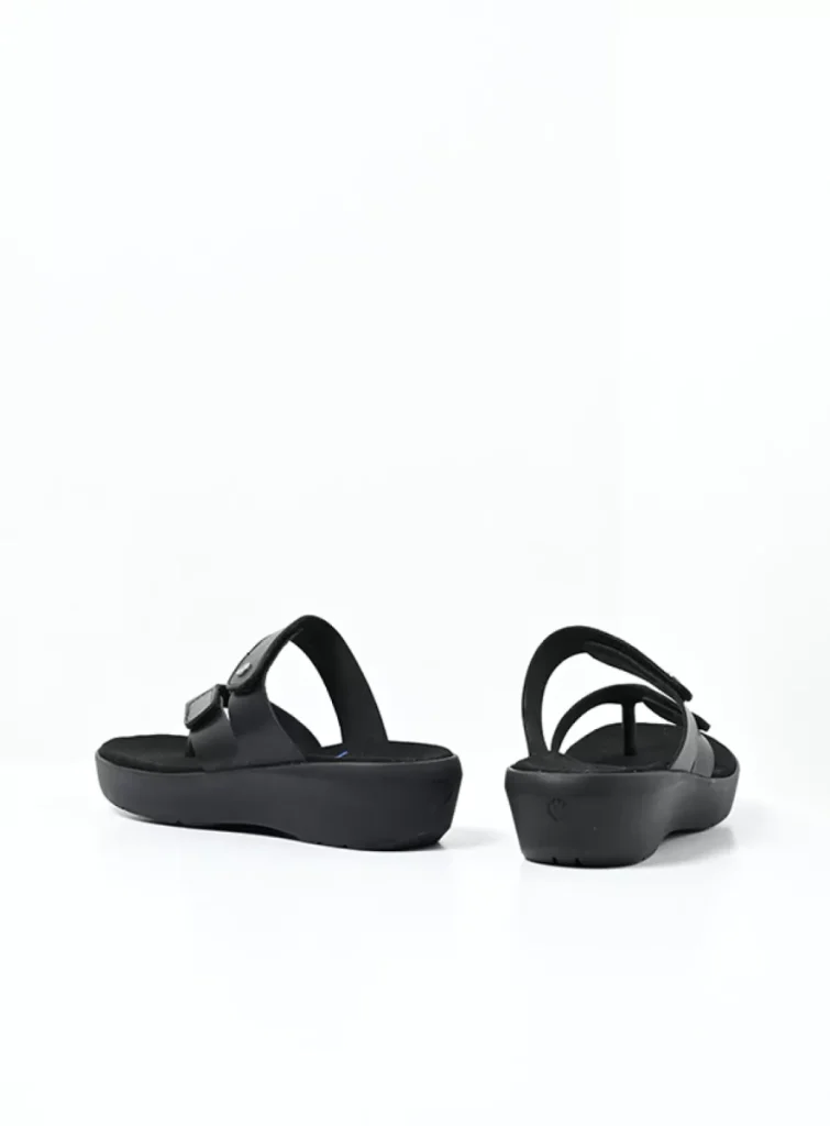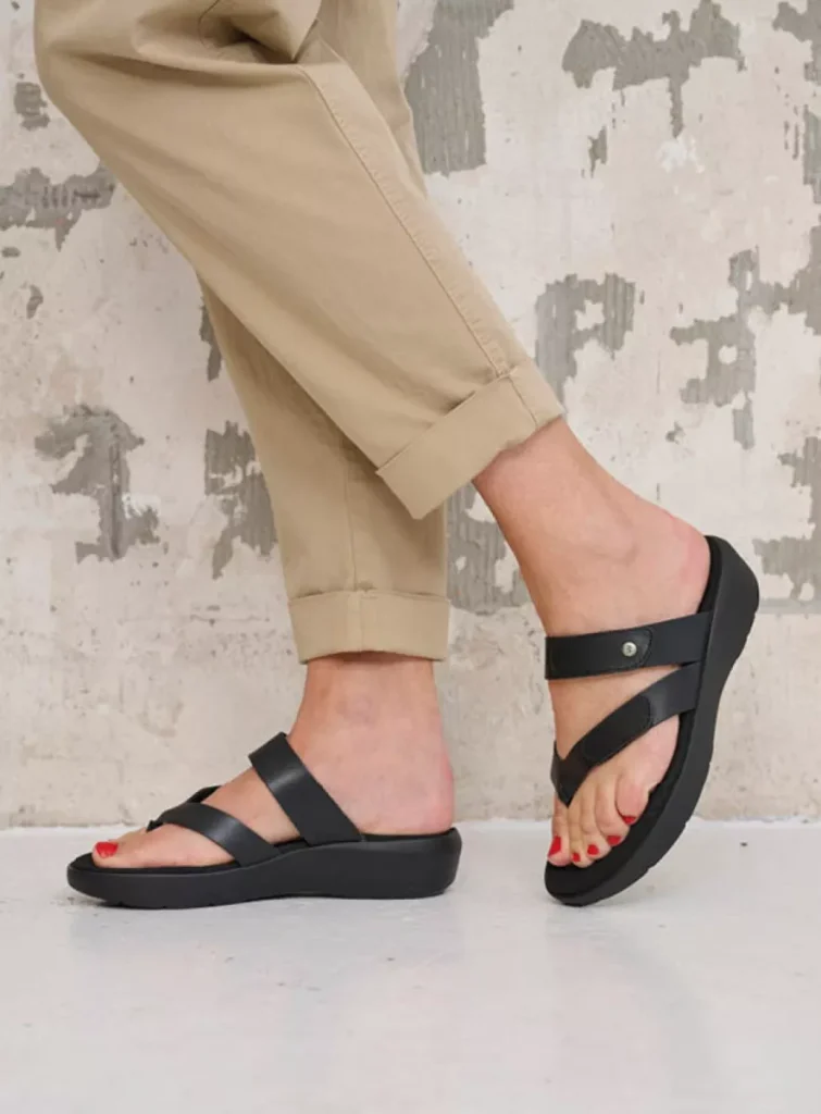 Schick und bequem: Das ist diese vegane Zehentrenner-Pantolette auf jeden Fall! Das Modell Hobie ist aus hochwertigen veganen Materialien gefertigt, die sich weich anfühlen und langlebig sind. Das Fußbett ist mit einer komfortablen Deckschicht bezogen, die Ihren Füßen auf angenehme Weise Halt bietet. Die Schicht aus Memory-Schaumstoff unter dieser Deckschicht sorgt für optimale Dämpfung bei jedem Schritt. Der Absatz des Hobie ist etwas höher, sodass Ihr Fuß natürlich abrollen kann. Mit den beiden Klettverschlüssen am Spann und am Vorfuß lässt sich die Pantolette mühelos anpassen. Das ist äußerst praktisch: So können Sie die Passform perfekt einstellen, und Ihre Zehen brauchen sich nicht „festzukrallen“, damit die Pantolette am Fuß bleibt.
