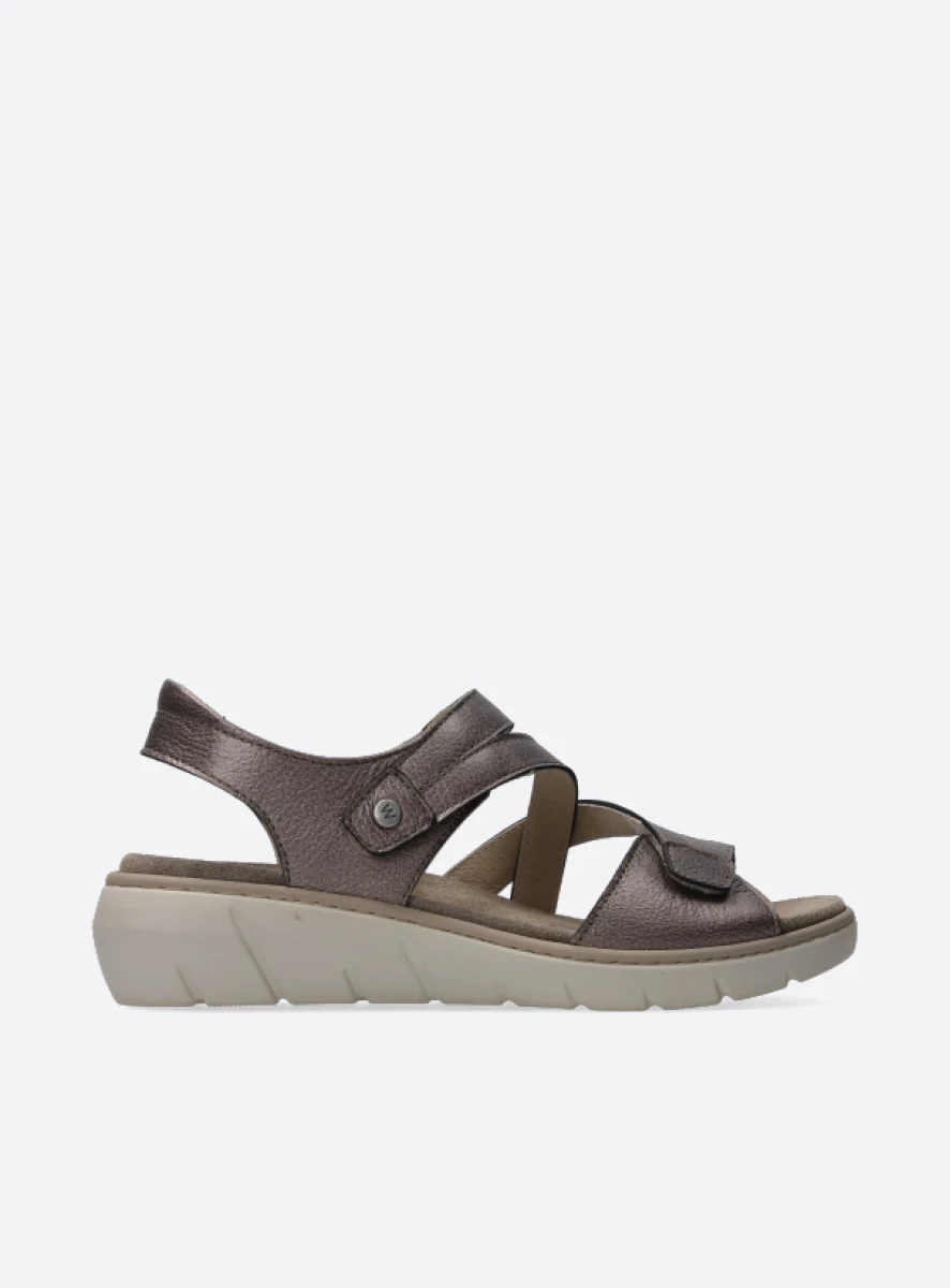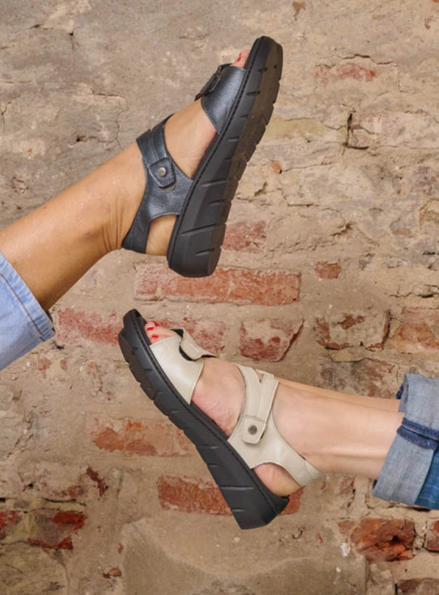 Der diagonale Riemen über dem Spann und das schimmernde Leder machen den eleganten Ikaria zu einem echten Blickfang. Die Sandale ist dank der Klettverschlüsse an mehreren Punkten verstellbar, sodass Sie sie perfekt an Ihren Fuß anpassen können. Das Fußbett ist mit angenehm weichem Veloursleder überzogen. Die stabile Sohle besteht aus PU – dies ist ein superleichtes Material, welches Ihre Füße den ganzen Tag beim Gehen unterstützt. Sie suchen eine Sandale, die sowohl schick als auch bequem ist? Dann ist der Ikaria das richtige Modell für Sie!
