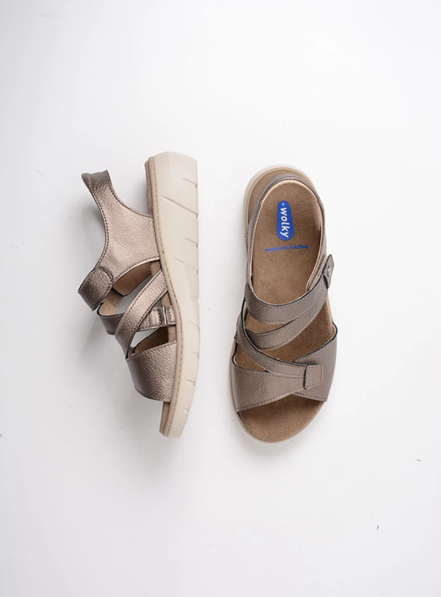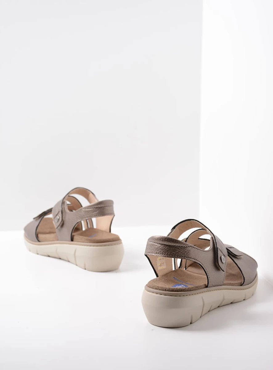 Der diagonale Riemen über dem Spann und das schimmernde Leder machen den eleganten Ikaria zu einem echten Blickfang. Die Sandale ist dank der Klettverschlüsse an mehreren Punkten verstellbar, sodass Sie sie perfekt an Ihren Fuß anpassen können. Das Fußbett ist mit angenehm weichem Veloursleder überzogen. Die stabile Sohle besteht aus PU – dies ist ein superleichtes Material, welches Ihre Füße den ganzen Tag beim Gehen unterstützt. Sie suchen eine Sandale, die sowohl schick als auch bequem ist? Dann ist der Ikaria das richtige Modell für Sie!